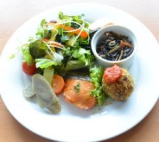 - 人気の有機豆腐と地鶏のハンバーグを野菜いっぱいソースで