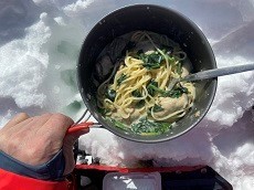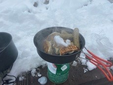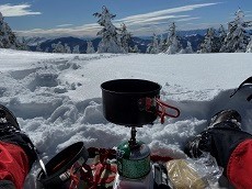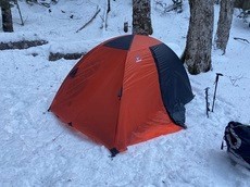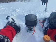 雪は3~40cm、平らなとこを探して足で圧雪してテントを張る。