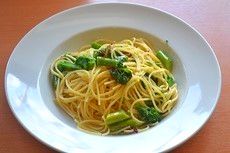 菜の花とドライトマトのペペロンチーノパスタです。