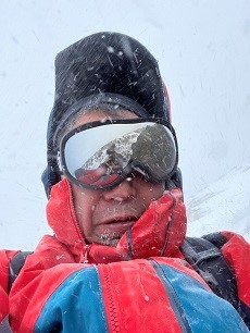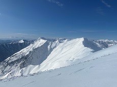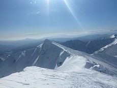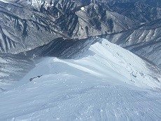 稜線に1時間半かかって着いたが、風速は20m以上、雪が顔に当たって痛い!