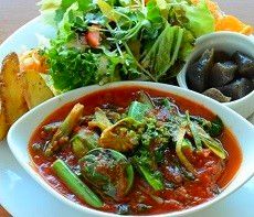 タラの芽・ふきのとう・こごみ・菜の花・セリなど春野菜も入った1日に必要と言われる350g以上の野菜15種類以上をイタリアントマトで煮込んだ野菜いっぱいのソース