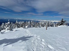 牧場みたいな広い高原を歩くも雪が多く早速スノーシューを装着、快適に登れる。