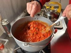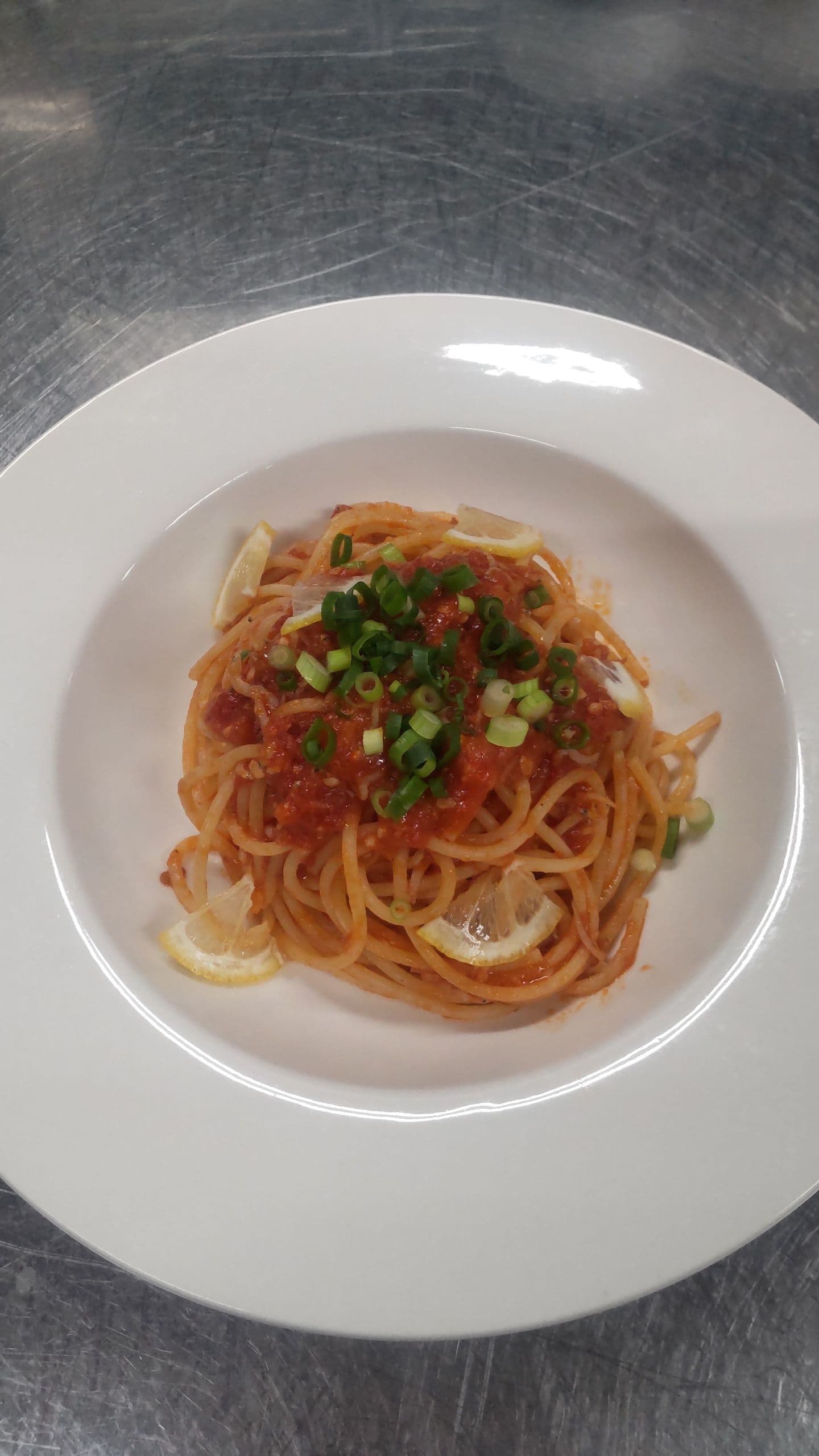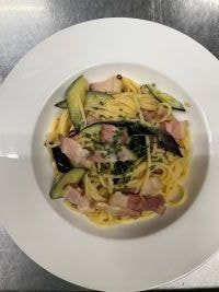 地鶏とたっぷりの野菜を自家製トマトソースでじっくり煮込だソースに旬のなすたっぷり