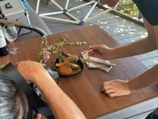 知り合いのプロのカメラマンに来て頂き、暑いテラスで写真を撮る。