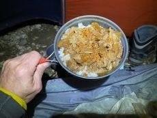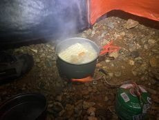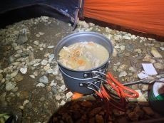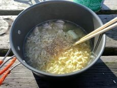 ここで朝ごはんの塩ラーメンを作る事に。