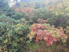 登山道は広葉樹林に囲まれ、まだこの辺は緑と黄色と赤の木々の中を登る。