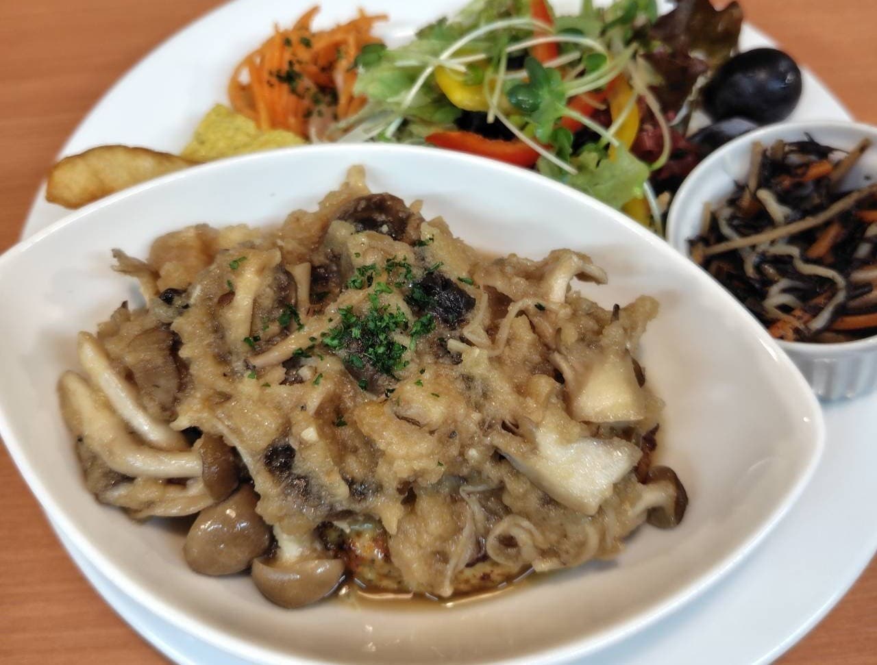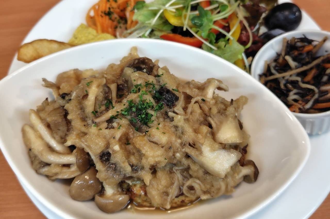 豆腐と地鶏のハンバーグに3種類のきのこ入り和風おろしソースをたっぷり。