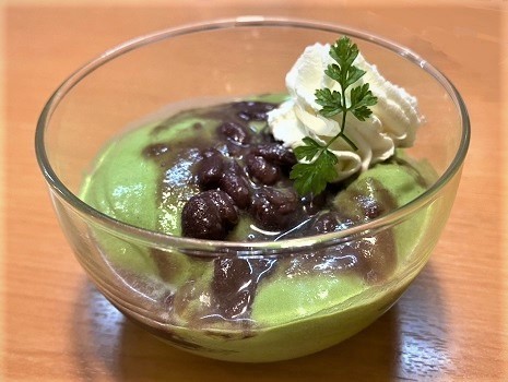国産紅芋使用。自家製栗の渋皮煮と自家製抹茶ムースの入った季節限定パフェ。少量のブランデー使用