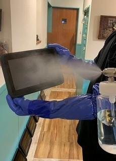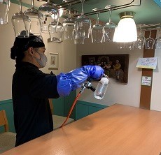 これらの菌を不活性化する加工です。リン酸チタニア系化合物液を媒体問わず噴霧できるとのことですので、お客様やスタッフなどが触れる箇所を散布しました。
