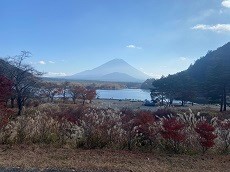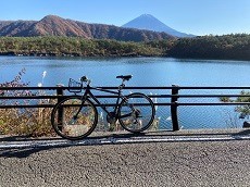 西湖湖畔を自転車で紅葉と湖と富士山を見ながら日差しを浴びて楽しいサイクリング。