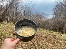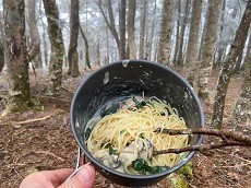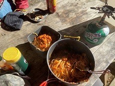 1時間ぐらい下って段々ガスって来たが、黒百合ヒュッテの手前でランチにする。