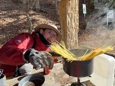 ダウンジャケットを着て雪の上にオーバーズボンを敷いてその上に座り、足にダブルの冬用ジャケットかけて手袋したまま食事にする。