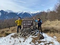 皆で山頂で写真を撮っていると雪を頂いた南アルプスが見えてきた!
