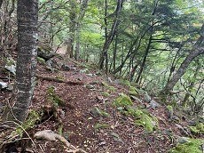 稜線なので上り下りを繰り返しながら、苔いっぱいの登山道を行く。