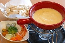 ナチュグレ特製チーズフォンデュが大盛りになって、山梨県産小麦使用のフランスパンとごまとクルミのパン