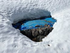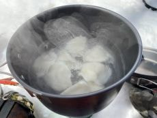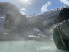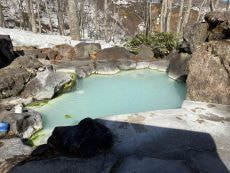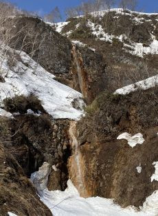 源泉の周りは、雪が融けて硫黄の匂いがする。