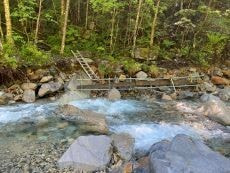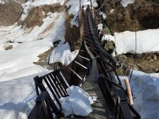 近くに着くと吊り橋の片方のワイヤーが切れて横になっているのだ