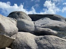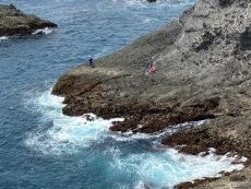 見附島に向けて岩を積んてあり行けるとこまで海を行くが、途中から岩が