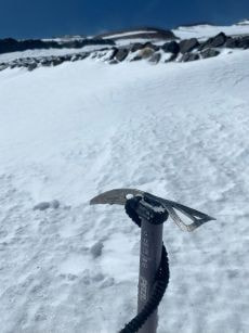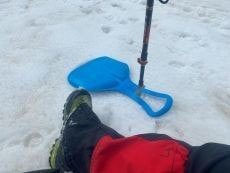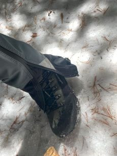 左足は、ズボンを登山靴にしっかり下ろし雪が入らない様に注意しながら