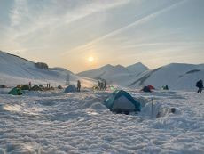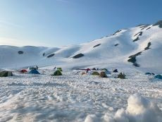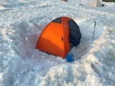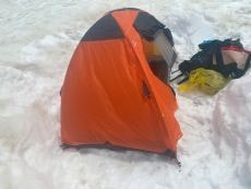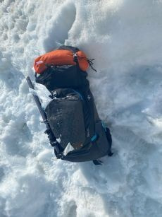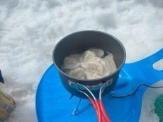 50cm以上ありそうな雪の上に空のザックを敷きその上に座って準備を